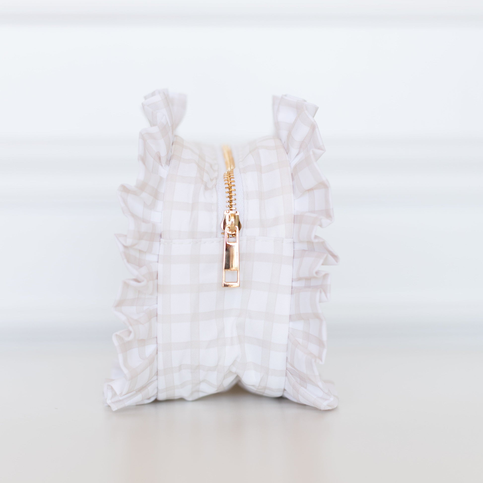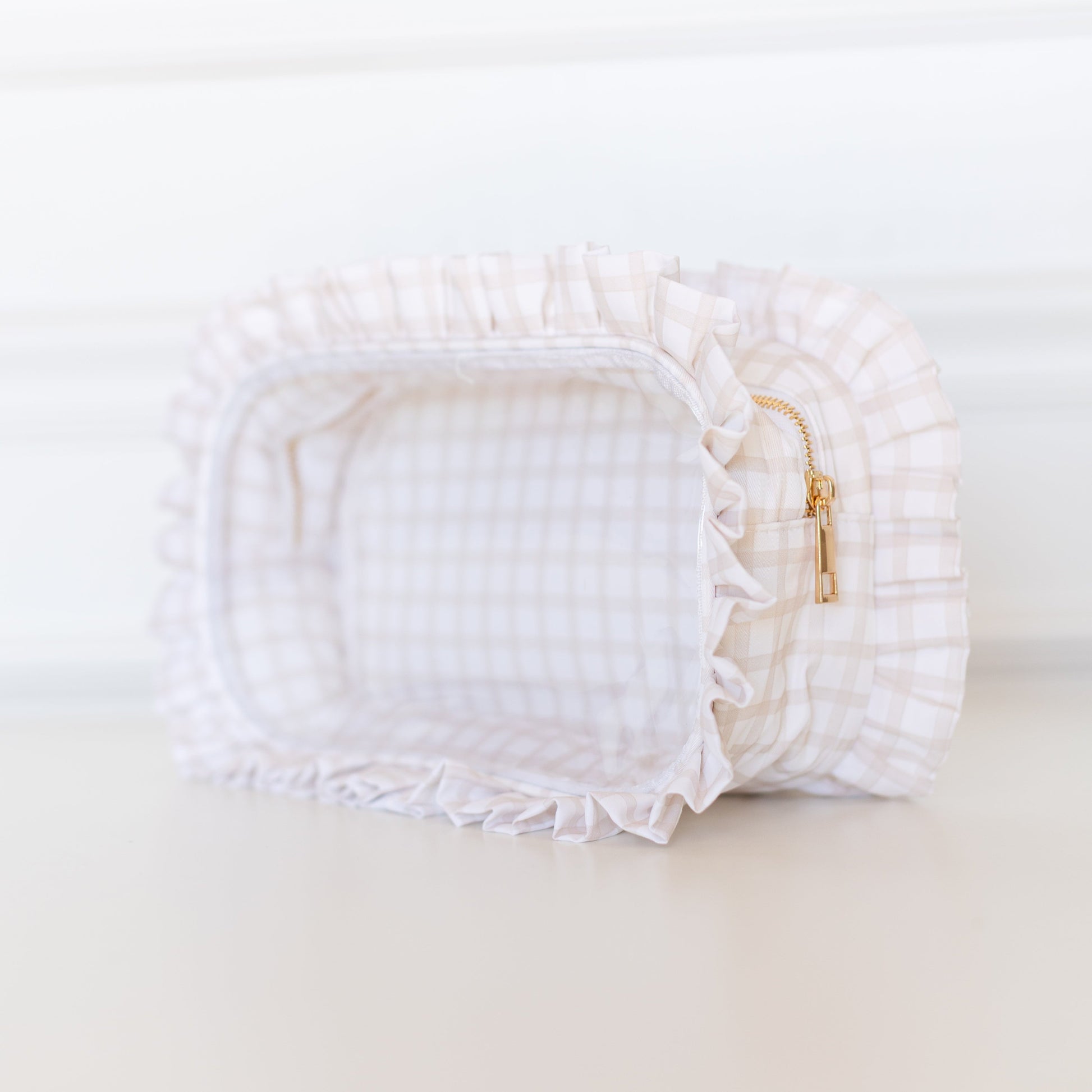 Say hello to chic organization made easy. Our beloved large pouch just got a fresh new look in Nude Plaid. A timeless neutral pattern with playful ruffled detailing for that signature HOLLIS charm. Designed to keep your essentials organized and within reach, this pouch features a clear side panel so you can quickly find what you need without the rummage.