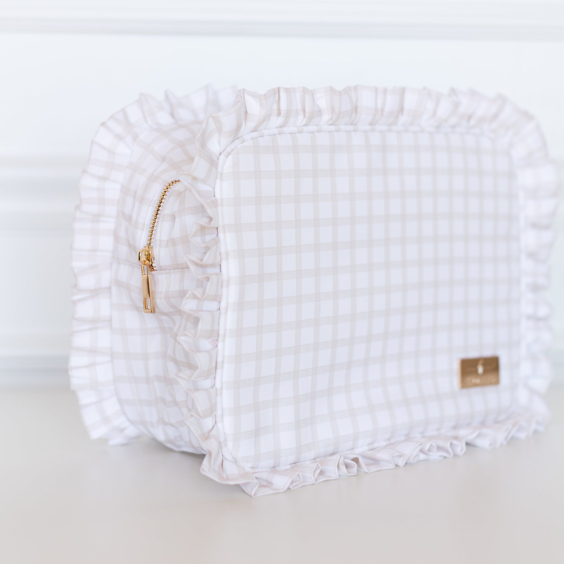 Your favorite pouch just got a major style upgrade. Meet the Nude Plaid Ruffled Nylon XL Pouch - where timeless neutrals meet everyday functionality. Designed to hold all your travel and daily essentials in one chic place, this spacious pouch features our signature ruffled edge detailing for that unmistakable HOLLIS touch.
